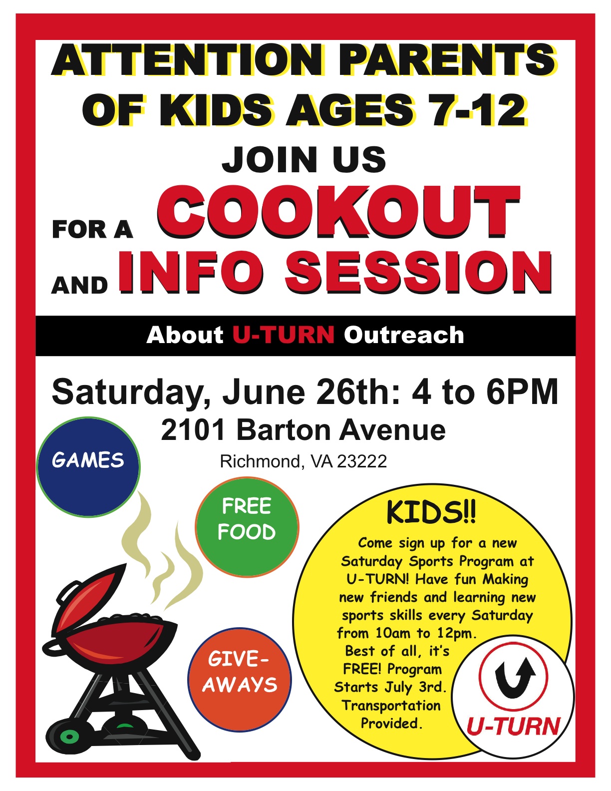 Next Saturday 6.26 from 4-6 we are partnering with U-Turn and 2 (maybe 3) Commonwealth Chapel Missional Communities to throw a neighborhood cook-out for the kids 7-12 and their parents. We are introducing a new Saturday morning program that will allow kids to go to U-Turn to play, have a snack and take a little time for the Word. Praying that Larry, Deshawn and Bishop will go. Terence is a little too old, but maybe he can be a Jr Leader. We will have to see. Please join us in prayer for this outreach!